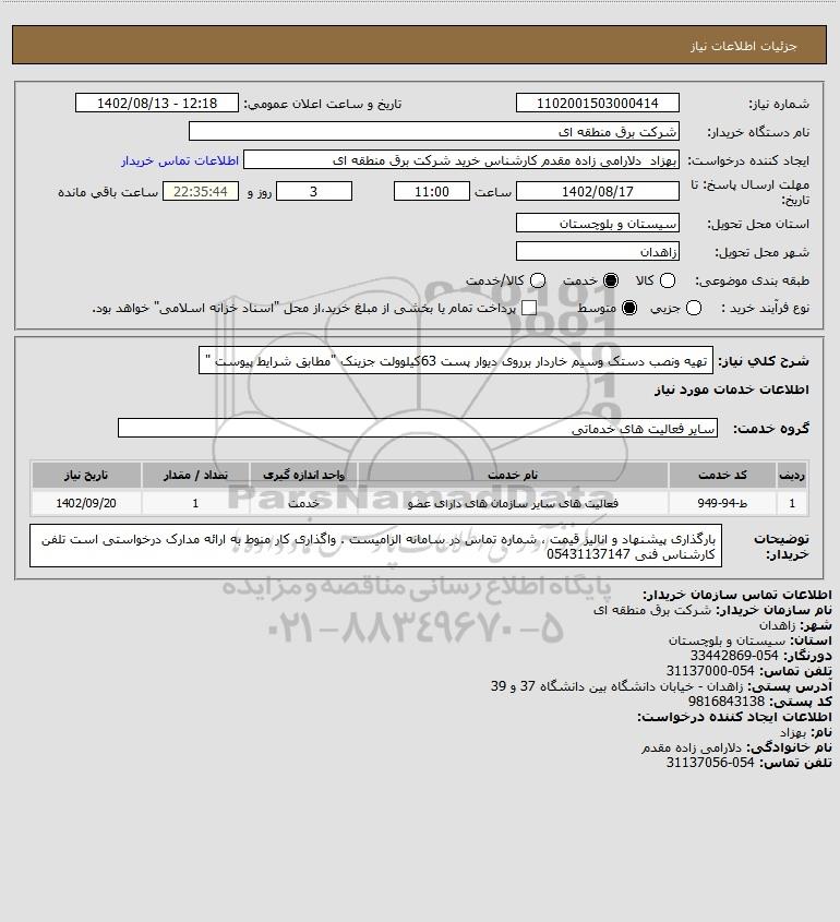 استعلام تهیه ونصب دستک وسیم خاردار برروی دیوار پست 63کیلوولت جزینک "مطابق شرایط پیوست ", استعلام تهیه ونصب دستک وسیم خاردار برروی دیوار پست 63کیلوولت جزینک "مطابق شرایط پیوست "