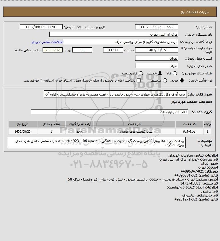 شرح کلی نیاز: جمع آوری دکل 21 متری مهاری سه وجهی قاعده 35 و نصب مجدد به همراه فوندانسیون و لوازم آن