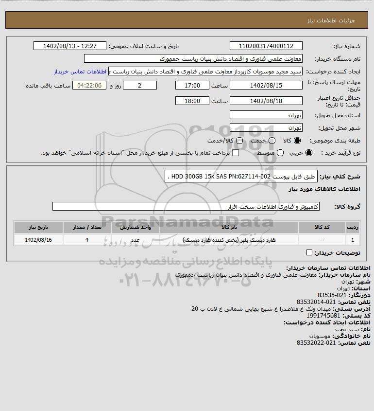 شرح کلی نیاز: طبق فایل پیوست HDD 300GB 15k SAS PN:627114-002 .