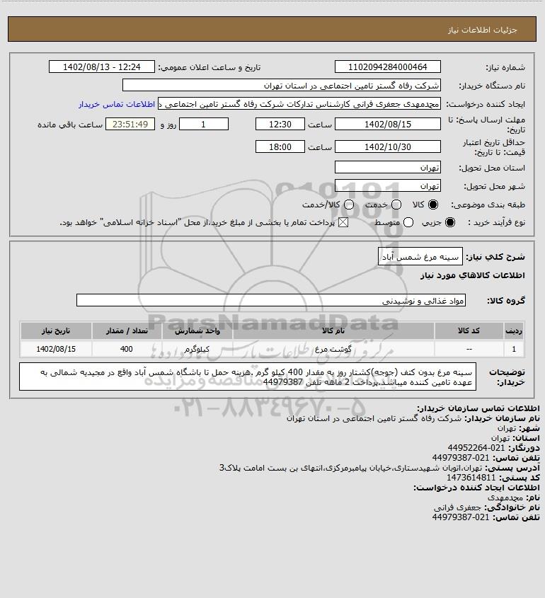 شرح کلی نیاز: سینه مرغ شمس آباد