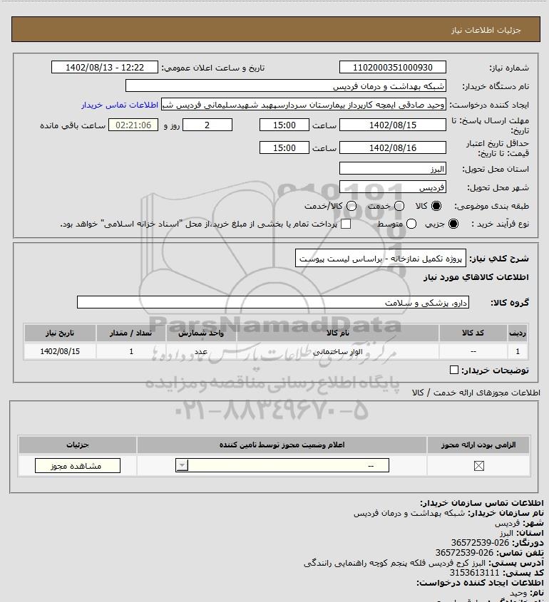 نام دستگاه خریدار:شبکه بهداشت و درمان فردیس