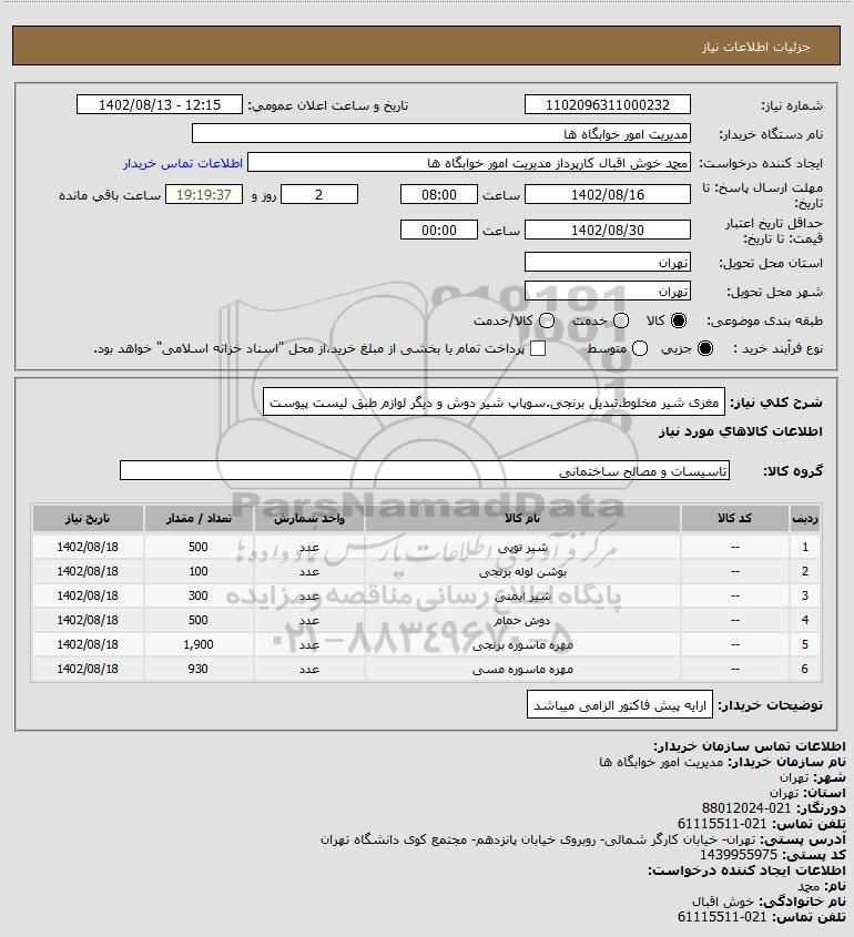 شرح کلی نیاز: مغزی شیر مخلوط.تبدیل برنجی.سوپاپ شیر دوش و دیگر لوازم طبق لیست پیوست