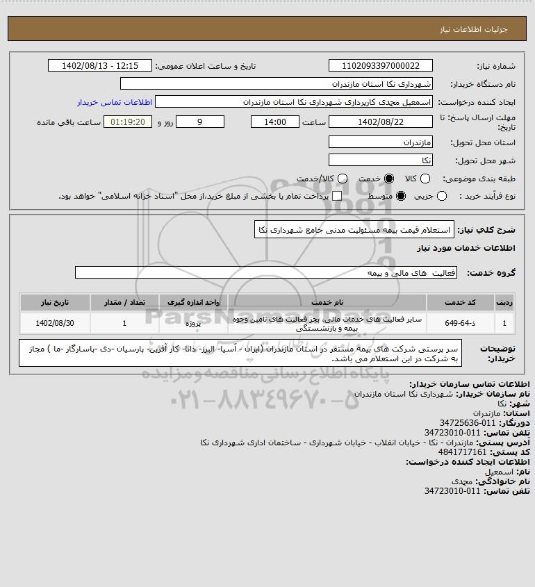 شرح کلی نیاز: استعلام قیمت بیمه مسئولیت مدنی جامع شهرداری نکا