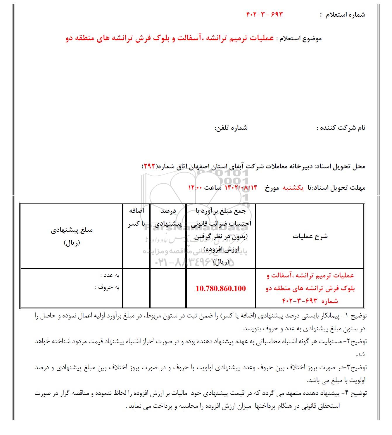 موضوع استعلام: عملیات ترمیم ترانشه ، آسفالت و بلوک فرش ترانشه های منطقه دو