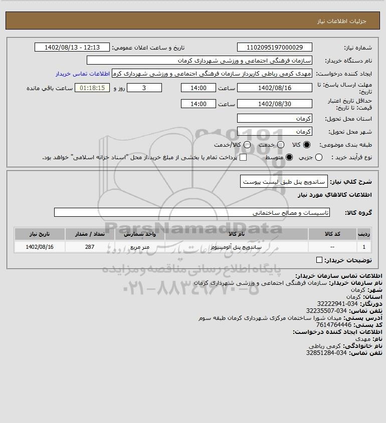 | 1 | -- | ساندویچ پنل آلومینیوم | متر مربع | 287 | 1402/08/16 |