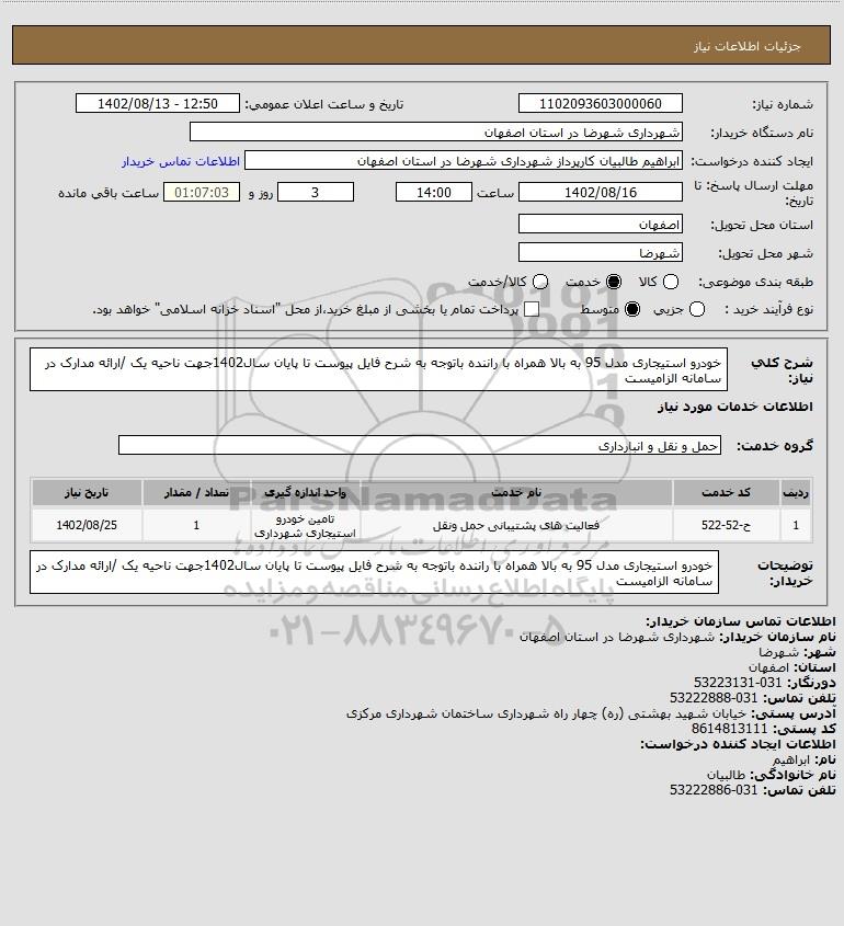 شرح کلی نیاز: خودرو استیجاری مدل 95 به بالا همراه با راننده باتوجه به شرح فایل پیوست تا پایان سال1402جهت ناحیه یک /ارائه مدارک در سامانه الزامیست