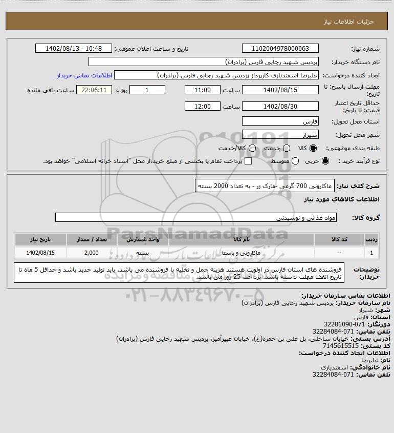 شرح کلی نیاز: ماکارونی 700 گرمی -مارک زر - به تعداد 2000 بسته