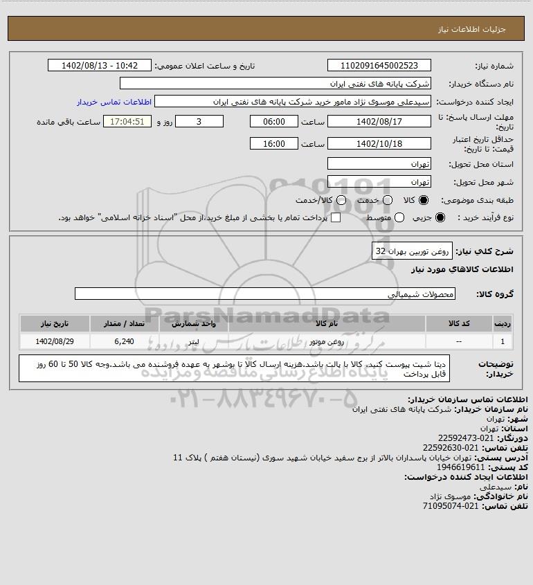 شرح کلی نیاز: روغن توربین بهران 32