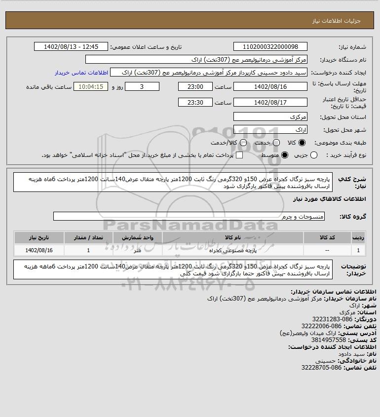 شرح کلی نیاز: پارچه سبز ترگال کجراه عرض 150و 320گرمی رنگ ثابت 1200متر پارچه متقال عرض140سانت 1200متر پرداخت 6ماه هزینه ارسال بافروشنده پیش فاکتور بارگزاری شود