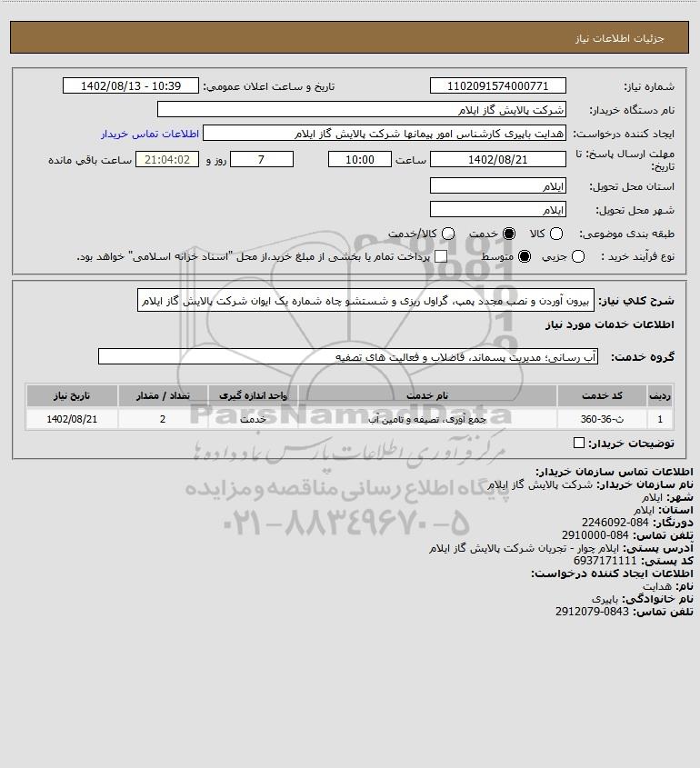 شرح کلی نیاز: بیرون آوردن و نصب مجدد پمپ، گراول ریزی و شستشو چاه شماره یک ایوان شرکت پالایش گاز ایلام