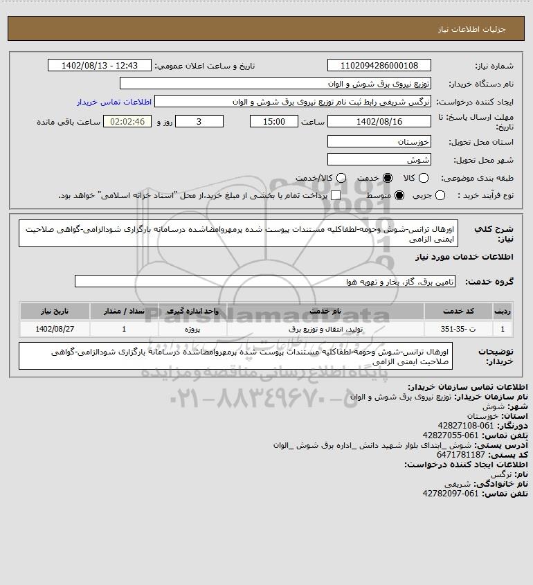 شرح کلی نیاز: اورهال ترانس-شوش وحومه-لطفاکلیه مستندات پیوست شده پرمهروامضاشده درسامانه بارگزاری شودالزامی-گواهی صلاحیت ایمنی الزامی