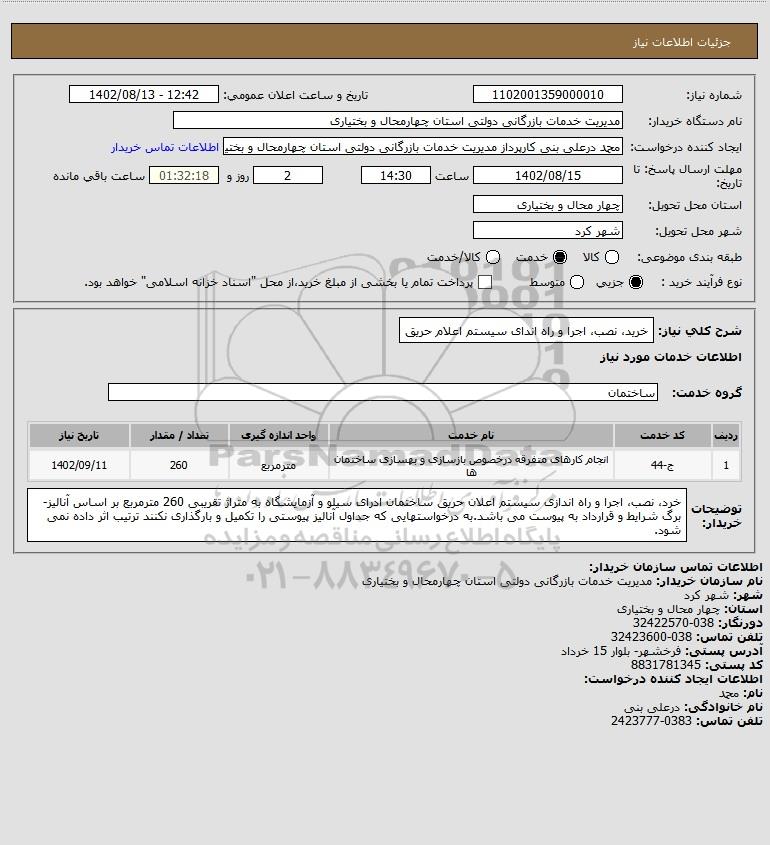 توضیحات خریدار:خرد، نصب، اجرا و راه اندازی سیستم اعلان حریق ساختمان ادرای سیلو و آزمایشگاه به متراژ تقریبی 260 مترمربع بر اساس آنالیز-برگ شرایط و قرارداد به پیوست می باشد.به درخواستهایی که جداول آنالیز پیوستی را تکمیل و بارگذاری نکنند ترتیب اثر داده نمی شود.
