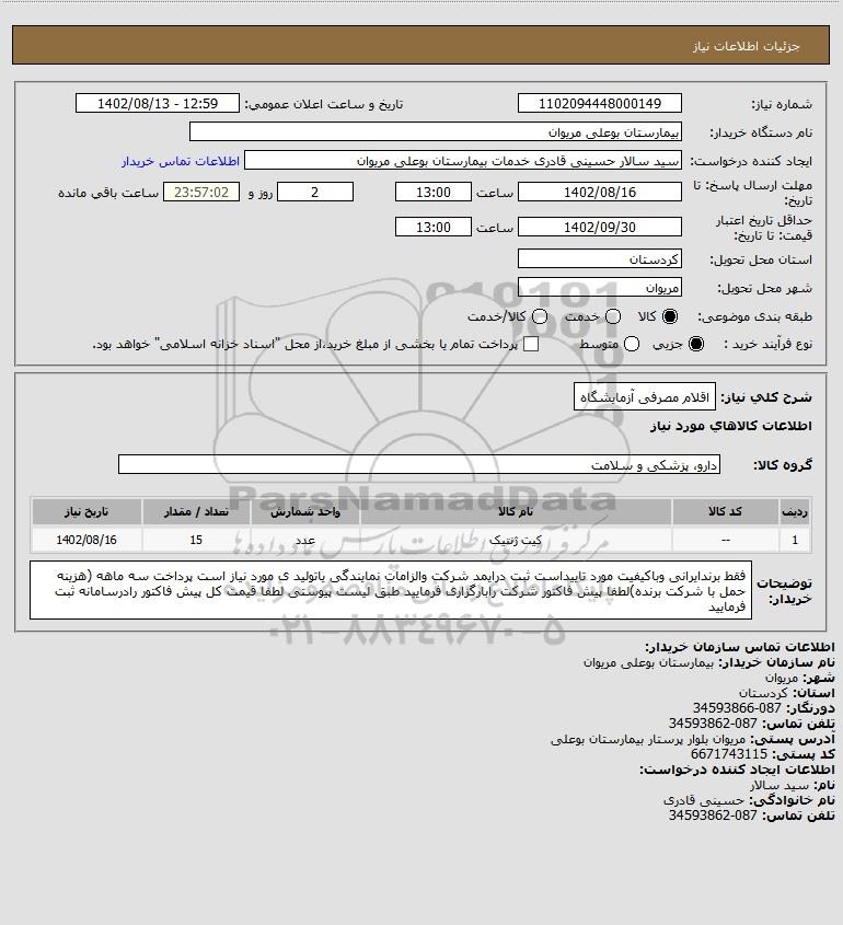| 1 | -- | کیت ژنتیک | عدد | 15 | 1402/08/16 |