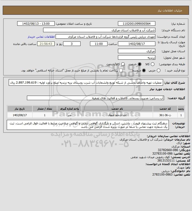 شرح کلی نیاز: عملیات تهیه واجرای بخشی از شبکه توزیع وانشعابات آب شرب روستای بریه زرندیه مبلغ برآورد اولیه : 2.897.199.619 ریال