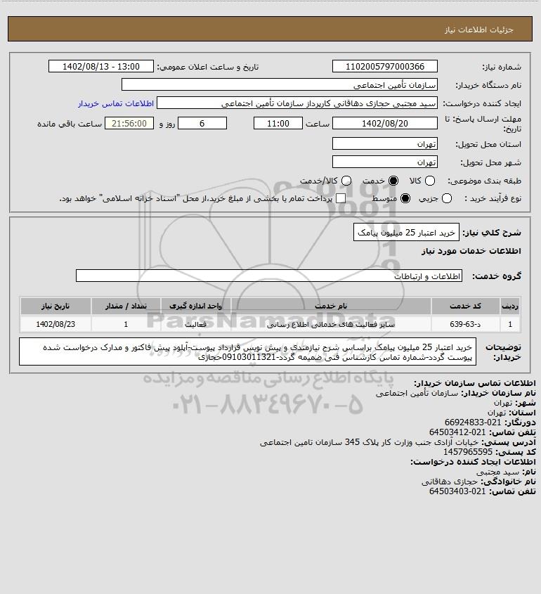 شرح کلی نیاز: خرید اعتبار 25 میلیون پیامک