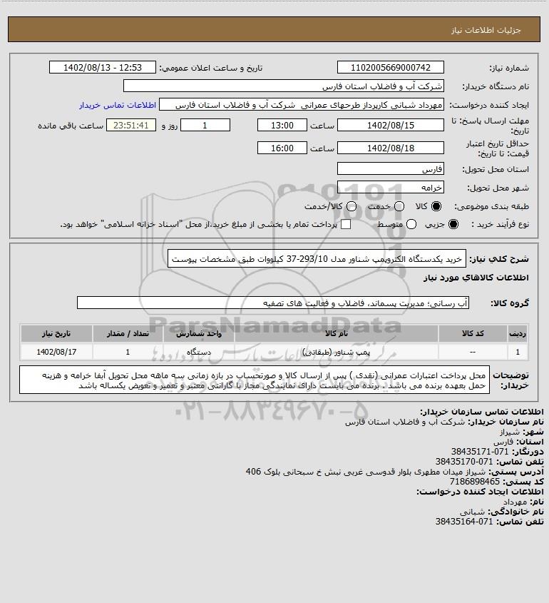 شرح کلی نیاز: خرید یکدستگاه الکتروپمپ شناور مدل 293/10-37 کیلووات طبق مشخصات پیوست