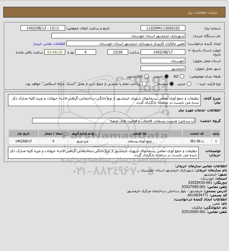 شرح کلی نیاز: تنظیفات و جمع آوری تمامی پسمانهای شهری خرمشهر از نوع(خانگی-ساختمانی-گیاهی-لاشه حیوانات و غیره کلیه مدارک ذکر شده می بایست در سامانه بارگزاری گردد.