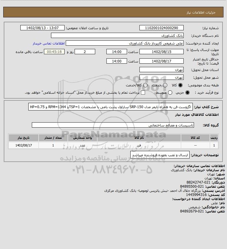 شرح کلی نیاز: اگزوست فن به همراه تایمر مدل SRP-150 ساراول پشت بامی با مشخصات TSP=1و RPM=1344 و HP=0.75