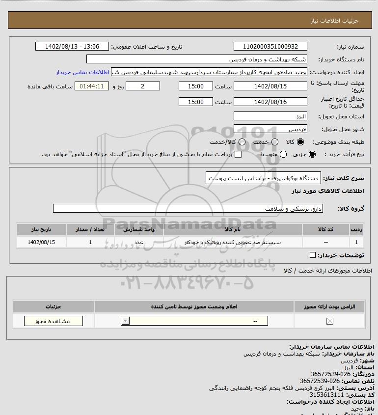 نام دستگاه خریدار:شبکه بهداشت و درمان فردیس