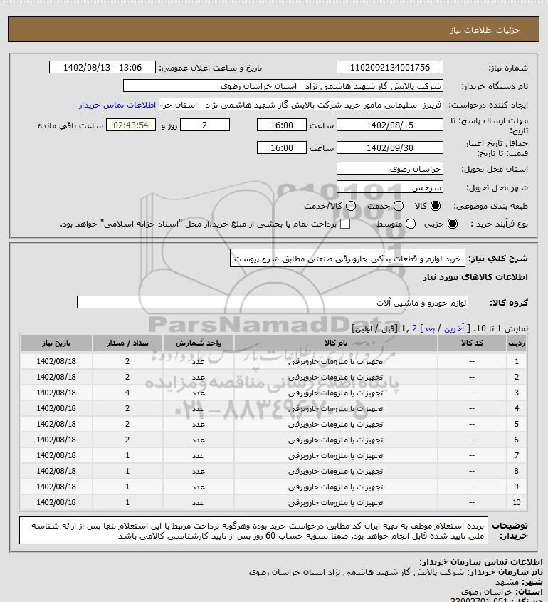 نام دستگاه خریدار:شرکت پالایش گاز شهید هاشمی نژاد استان خراسان رضوی