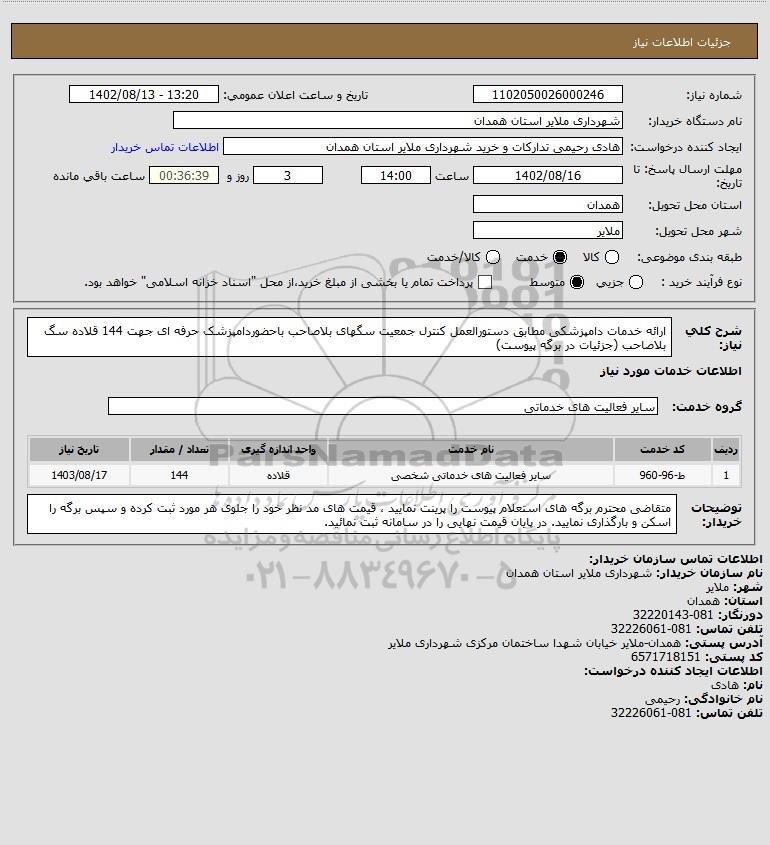 شرح کلی نیاز: ارائه خدمات دامپزشکی مطابق دستورالعمل کنترل جمعیت سگهای بلاصاحب باحضوردامپزشک حرفه ای جهت 144 قلاده سگ بلاصاحب (جزئیات در برگه پیوست)