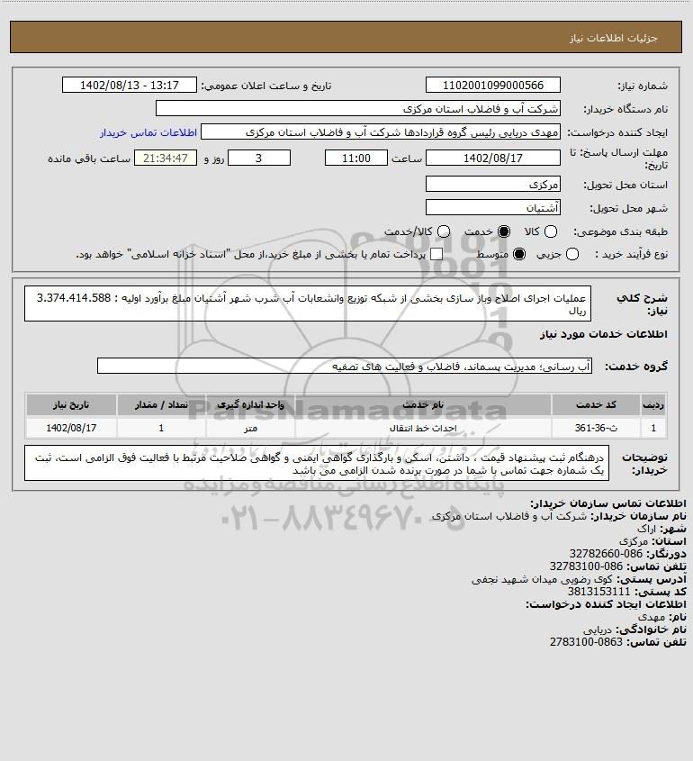 شرح کلی نیاز: عملیات اجرای اصلاح وباز سازی بخشی از شبکه توزیع وانشعابات آب شرب شهر آشتیان مبلغ برآورد اولیه : 3.374.414.588 ریال