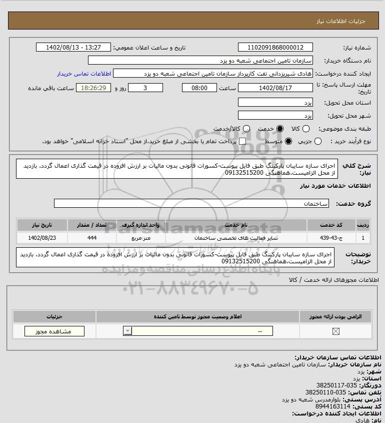 شرح کلی نیاز: اجرای سازه سایبان پارکینگ طبق فایل پیوست-کسورات قانونی بدون مالیات بر ارزش افزوده در قیمت گذاری اعمال گردد. بازدید از محل الزامیست.هماهنگی 09132515200
