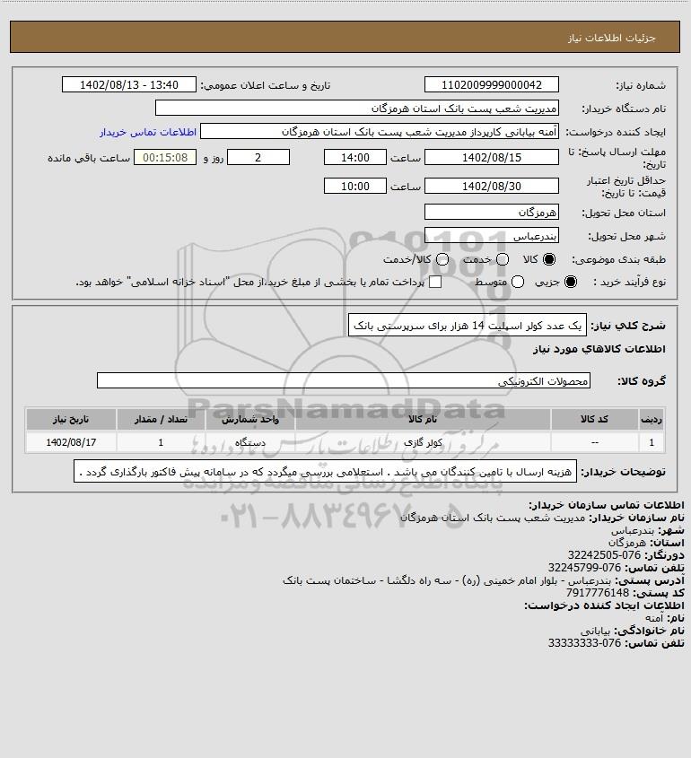 استعلام یک عدد کولر اسپلیت 14 هزار برای سرپرستی بانک, استعلام یک عدد کولر اسپلیت 14 هزار برای سرپرستی بانک