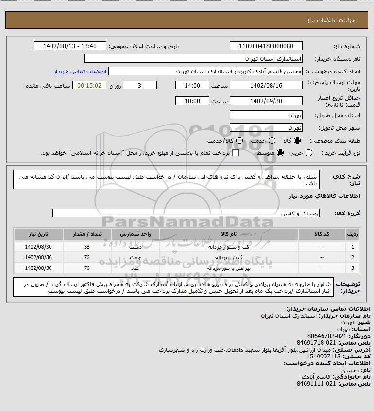 استعلام شلوار با جلیقه ،پیراهن و کفش برای نیرو های این سازمان / در خواست طبق لیست پیوست می باشد /ایران کد مشابه می باشد, استعلام شلوار با جلیقه ،پیراهن و کفش برای نیرو های این سازمان / در خواست طبق لیست پیوست می باشد /ایران کد مشابه می باشد