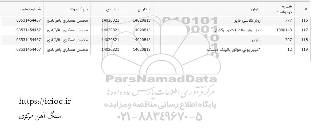 | 1090143 | ریل نوار نقاله رفت و برگشتی | 1402.8.21 | محسن عسکری باقرآباد | 03531454467 |