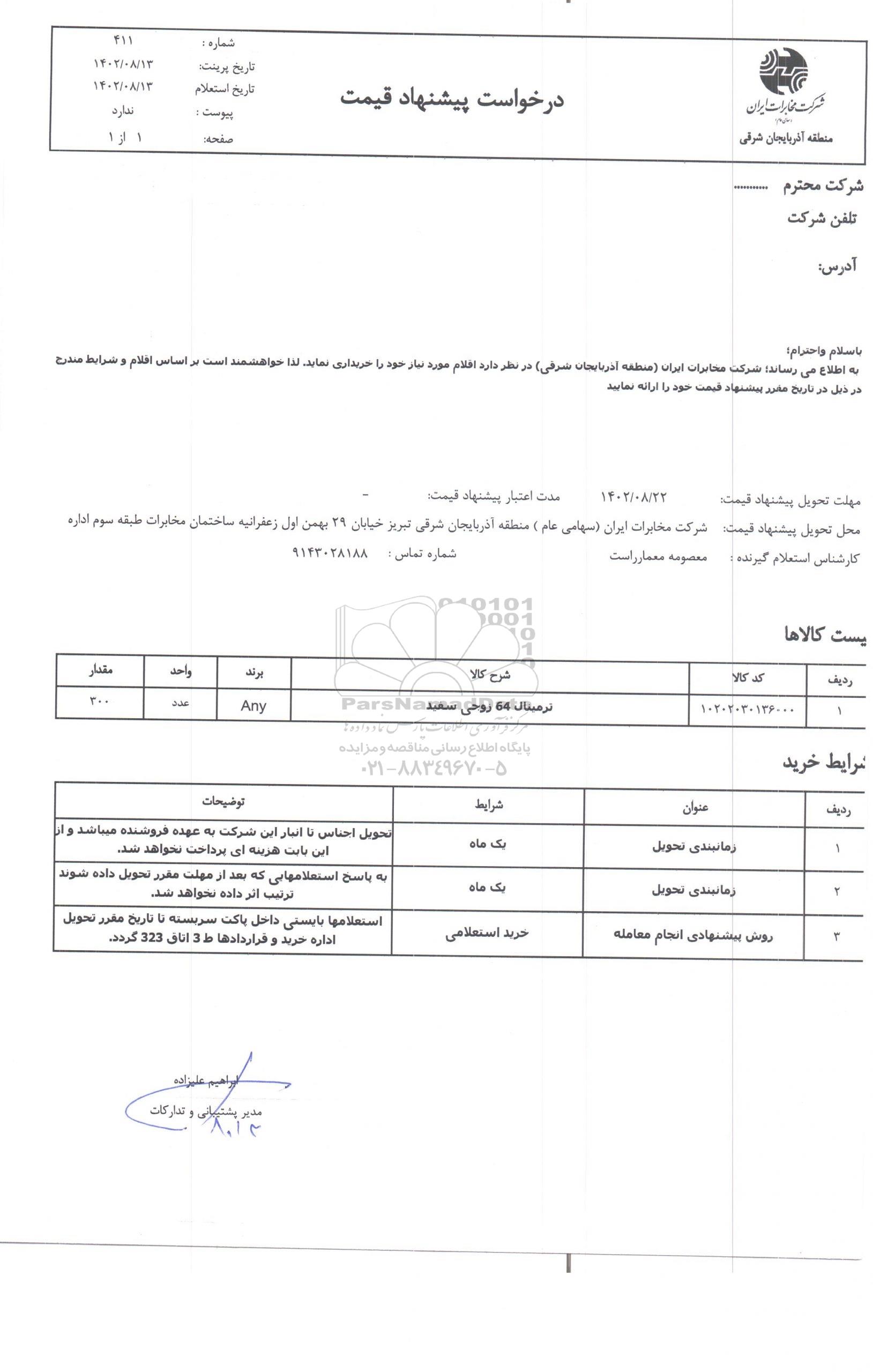 شرکت مخابرات ایران (منطقه آذربایجان شرقی) در نظر دارد اقلام مورد نیاز خود را خریداری نماید. لذا خواهشمند است براساس اقلام و شرایط مندرج در ذیل در تاریخ مقرر پیشنهاد قیمت خود را ارایه نمایند