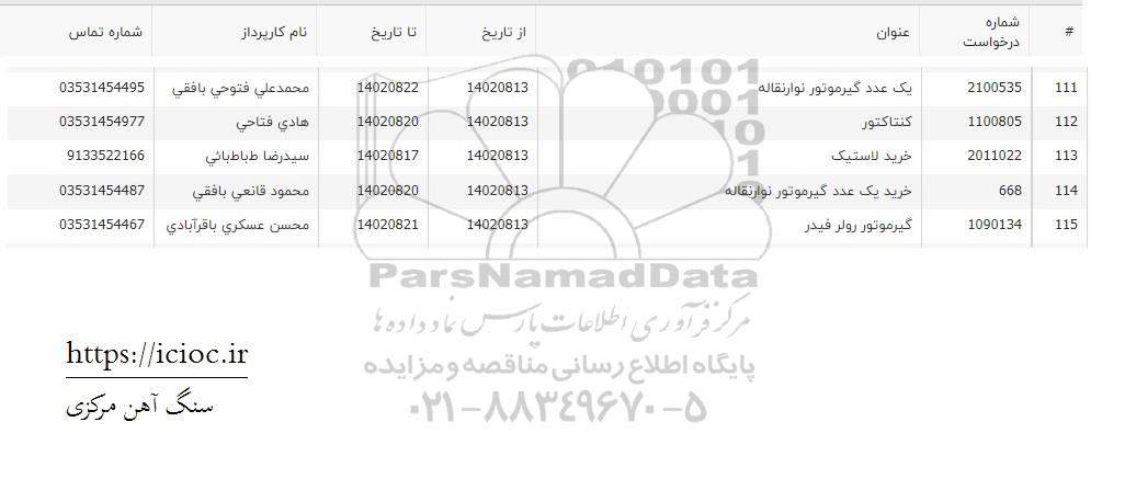 | 111 | 2100535 | یک عدد گیرموتور نوار نقاله | 1402.8.22 | محمد علی فتوحی بافقی | 03531454495 |