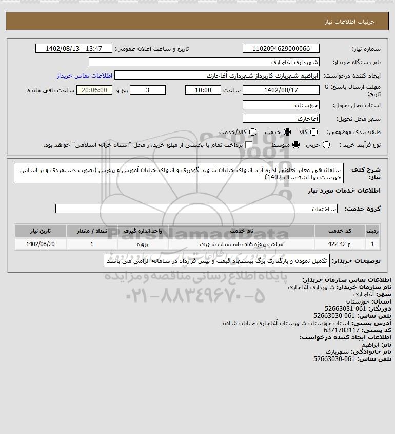 شرح کلی نیاز: ساماندهی معابر تعاونی اداره آب، انتهای خیابان شهید گودرزی و انتهای خیابان آموزش و پرورش (بصورت دستمزدی و بر اساس فهرست بها ابنیه سال 1402)