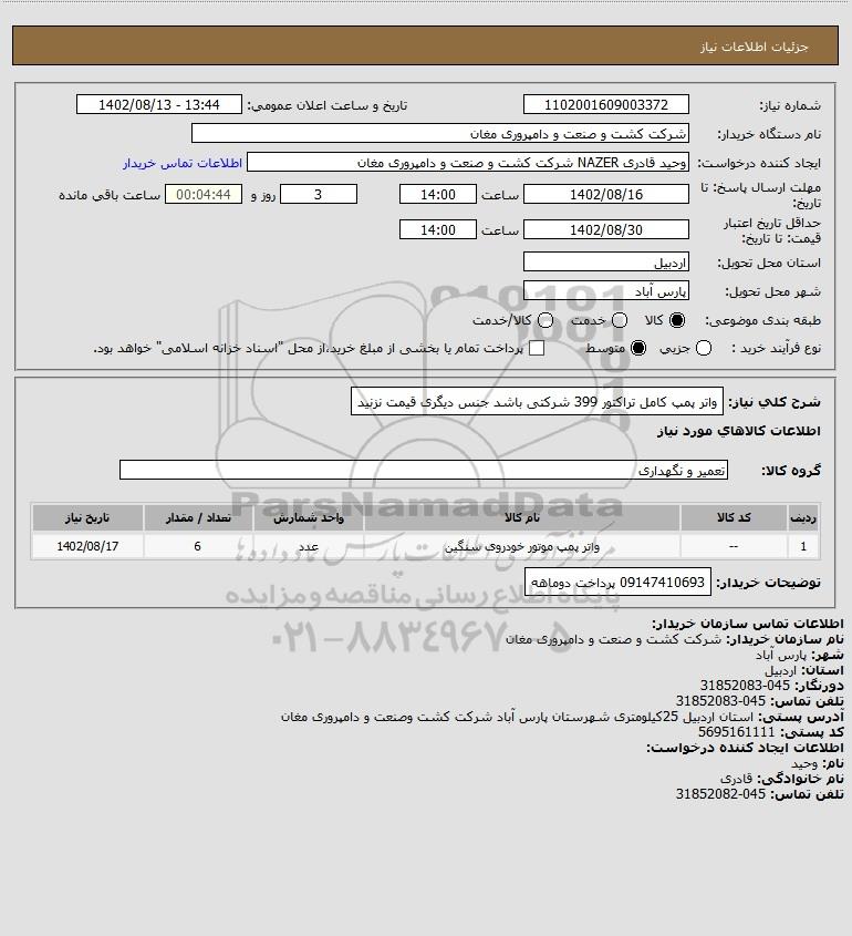 شرح کلی نیاز: واتر پمپ کامل تراکتور 399 شرکتی باشد جنس دیگری قیمت نزنید