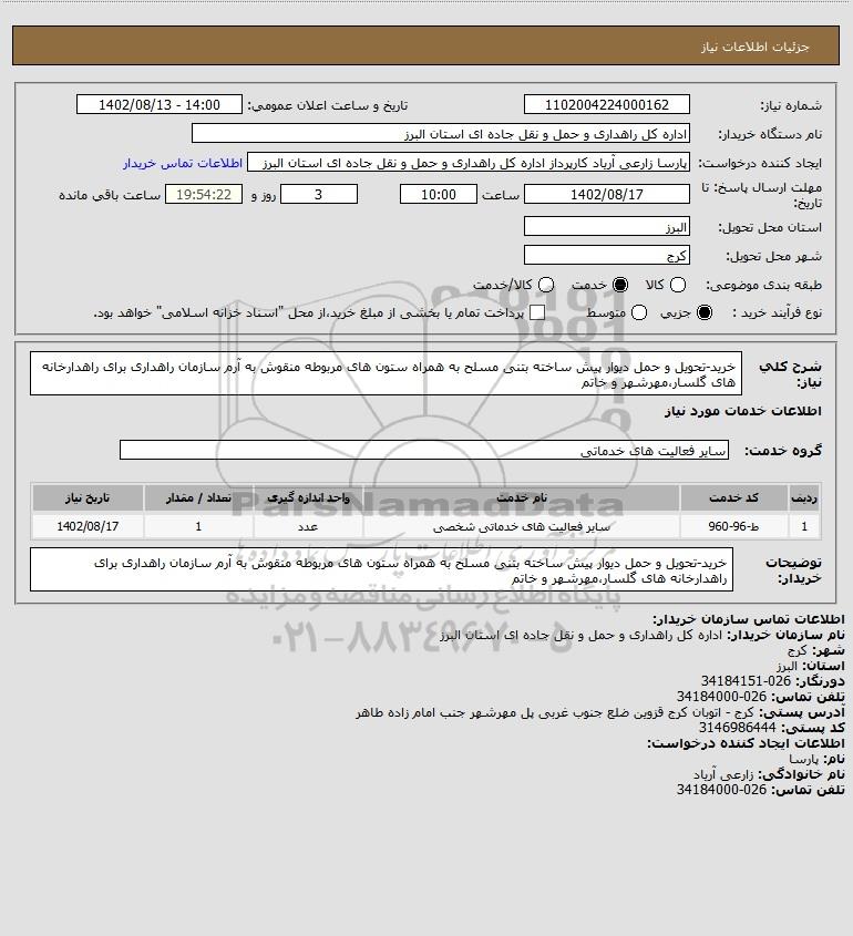 شرح کلی نیاز: خرید-تحویل و حمل دیوار پیش ساخته بتنی مسلح به همراه ستون های مربوطه منقوش به آرم سازمان راهداری برای راهدارخانه های گلسار،مهرشهر و خاتم