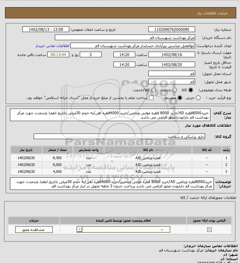 شرح کلی نیاز: خرید8500قطره AD/خرید 8000 قطره مولتی ویتامین/خرید 4000قطره اهن/به حجم 30میلی باتاریخ انقضا بلندمدت جهت مرکز بهداشت قم دارابودن مجوز الزامی می باشد