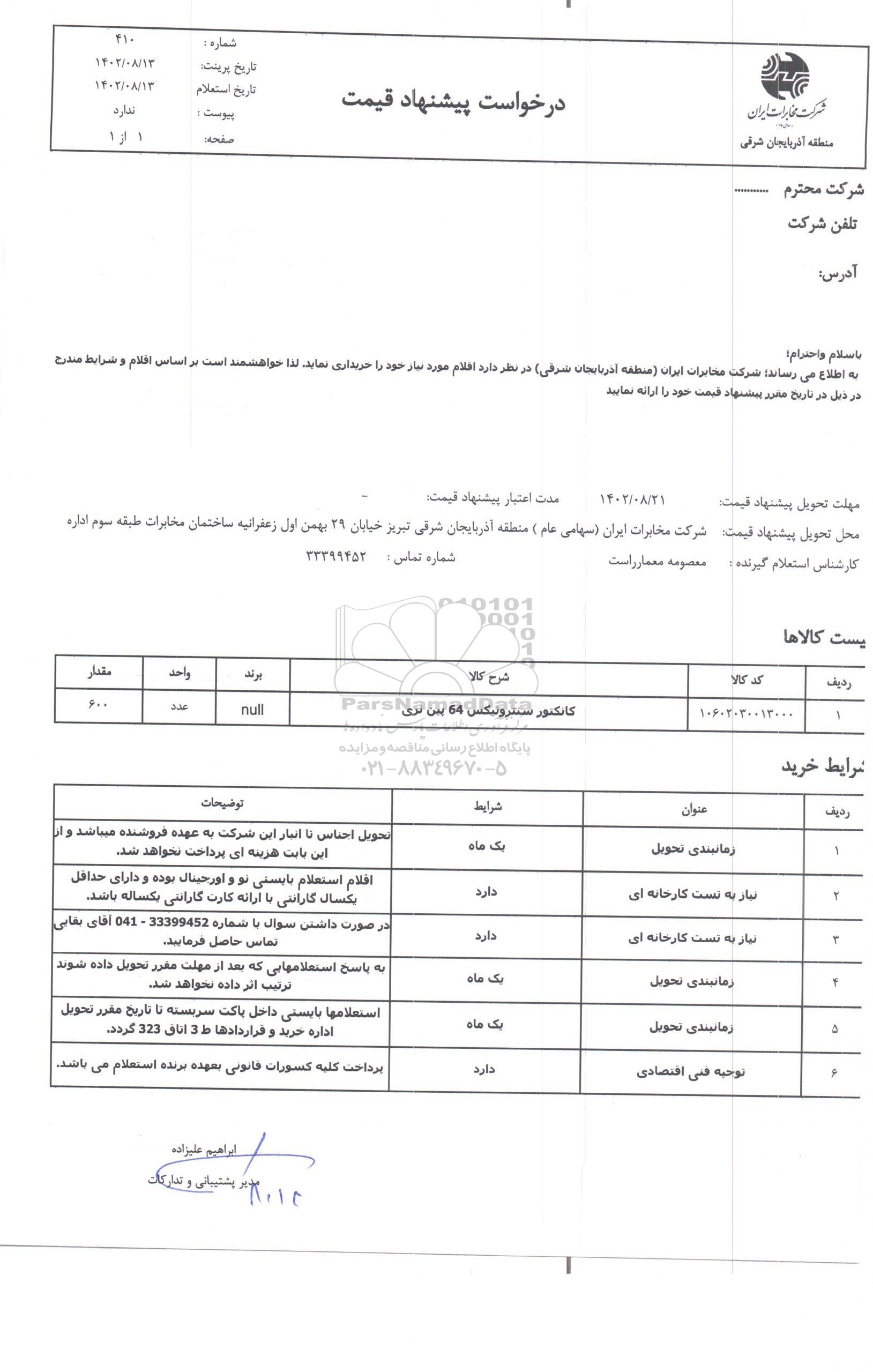 احتراما به اطلاع می رساند شرکت مخابرات ایران (منطقه آذربایجان شرقی) در نظر دارد اقلام مورد نیاز خود را خریداری نماید. لذا خواهشمند است براساس اقلا و شرایط مندرج در ذیل در تاریخ مقرر پیشنهاد قیمت خود را ارایه نمایید.