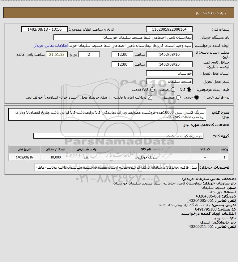| 1 | -- | سرنگ خونگیری | عدد | 10,000 | 1402/08/16 |