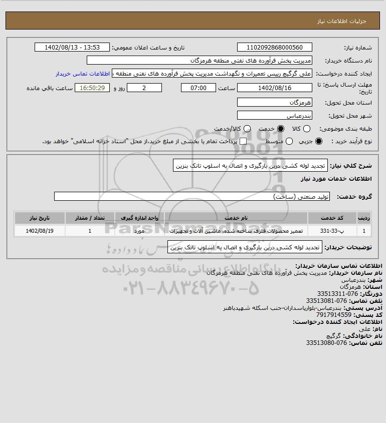 استعلام تجدید لوله کشی درین بارگیری و اتصال به اسلوپ تانک بنزین, استعلام تجدید لوله کشی درین بارگیری و اتصال به اسلوپ تانک بنزین