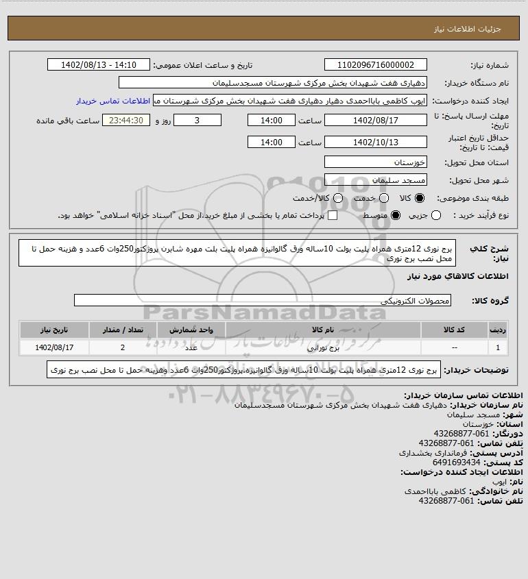 شرح کلی نیاز: برج نوری 12متری همراه پلیت بولت 10ساله ورق گالوانیزه همراه پلیت بلت مهره شابرن