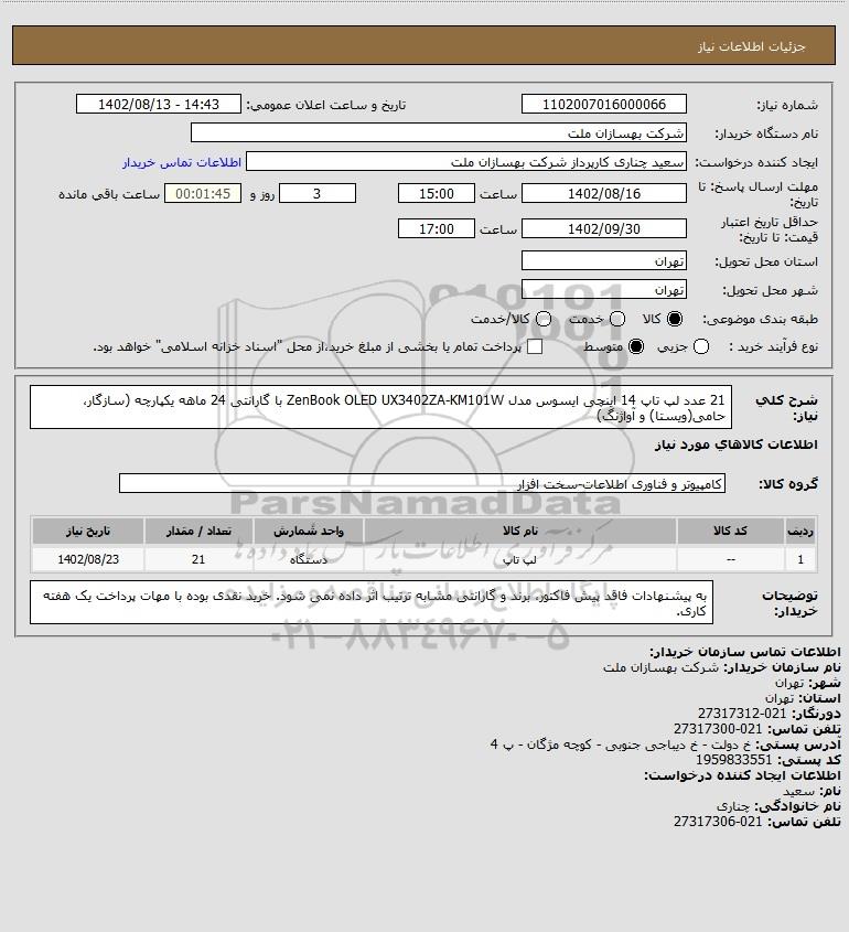 شرح کلی نیاز: 21 عدد لپ تاپ 14 اینچی ایسوس مدل ZenBook OLED UX3402ZA-KM101W با گارانتی 24 ماهه یکپارچه (سازگار، حامی(ویستا) و آواژنگ)