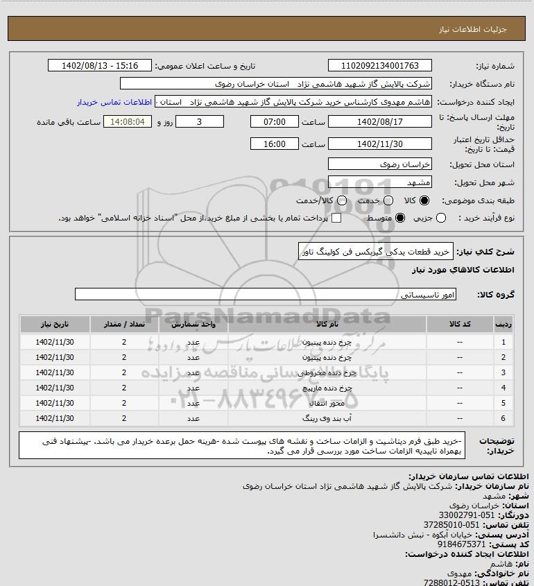 نام دستگاه خریدار:شرکت پالایش گاز شهید هاشمی نژاد استان خراسان رضوی