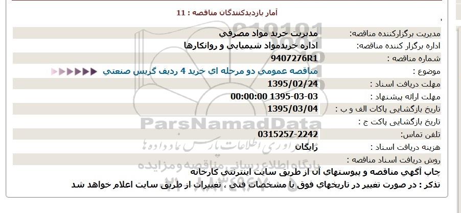 موضوع : مناقصه عمومی دو مرحله ای خرید 4 ردیف گریس صنعتی