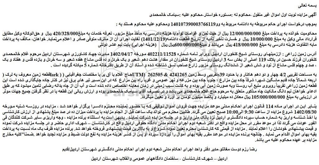 آدرس زمین زراعی : اززمینهای روستای شیخ کلخوران اردبیل .وبرابر نامه شماره 402211/11528 مورخه 1402/04/17 مدیرت جهاد کشاورزی شهرستان اردبیل مرحوم غلام خانمحمدی کلخوران فرزند حسین در پلاک 119 اصلی از بخش سه 3 اردبیل روستای شیخ کلخوران در مقدار هشت دهم  شعیر و یک خردل و ده فلس مشاع هفده شعیر و سه خردل و یازده فلس و هفتاد و یک ، صد و چهلم فلس مشاع از نود و شش شعیر از ششدانگ روستای مزبور زارع صاحب نسق شناخته شده و اسناد آن از طریق دفترخانه شماره 5 مبادله گردیده است .
