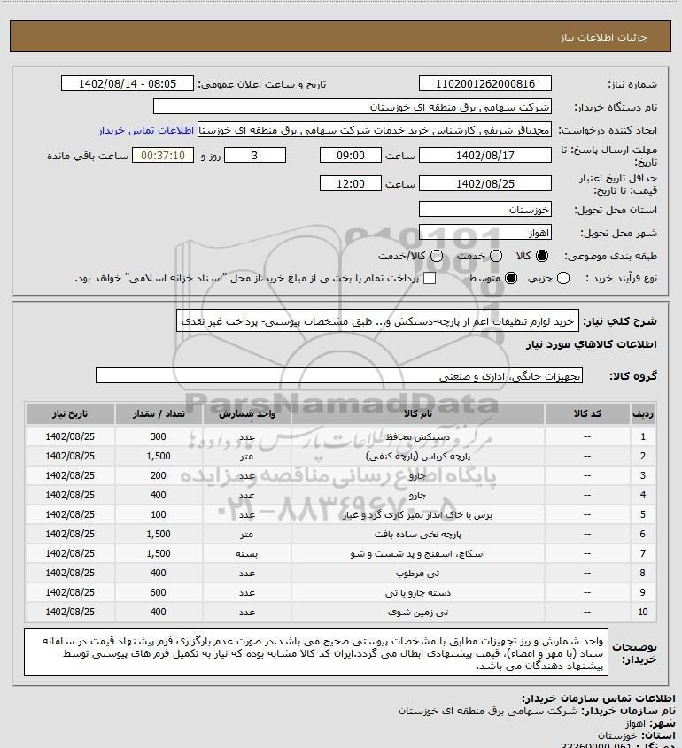 شرح کلی نیاز: خرید لوازم تنظیفات اعم از پارچه-دستکش و... ظبق مشخصات پیوستی- پرداخت غیر نقدی