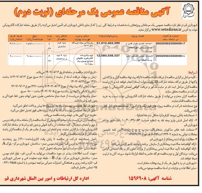 شهرداری قم در نظر دارد مناقصه عمومی یک مرحله ای پروژه های با مشخصات و شرایط کلی زیر را که از منابع داخلی شهرداری قم تامین اعتبار میگردد از طریق سامانه تدارکات الکترونیکی دولت به ادرس سایت ستاد برگزار نماید.