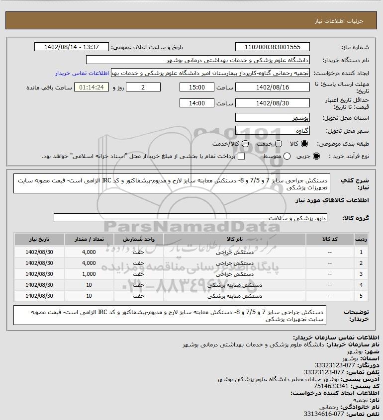 | 2 | -- | دستکش جراحی | جفت | 4,000 | 1402/08/30 |