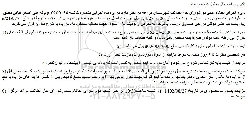 دایره اجرای احکام مدنی دو شورای حل اختلاف شهرستان مراغه در نظر دارد در پرونده اجرایی بشماره کلاسه 0200154 ج.م له علی اصغر لیاقی مطلق  و علیه شرکت تعاونی مهر  مبنی بر پرداخت مبلغ  124/275/500ریال  از بابت اصل خواسته و هزینه های دادرسی در حق محکوم له و مبلغ 6/213/775 ریال بابت نیم عشر دولتی در حق صندوق دولت ، با توجه به معرفی و توقیف مال  منقول جهت مطالبه محکوم به، مزایده به شرح ذیل برگزار می گردد.