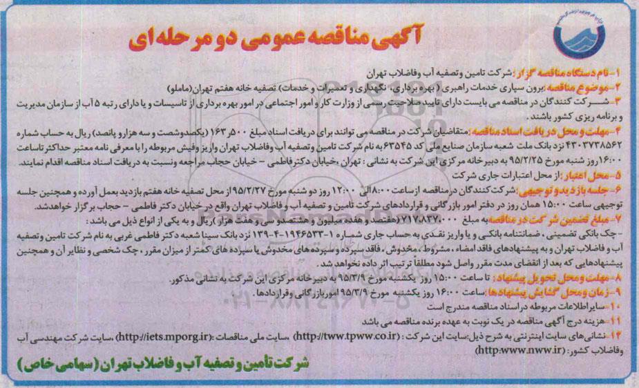 2-موضوع مناقصه: برون سپاری خدمات راهبری (بهره برداری، نگهداری و تعمیرات و خدمات) تصفیه خانه هفتم تهران (ماملو)