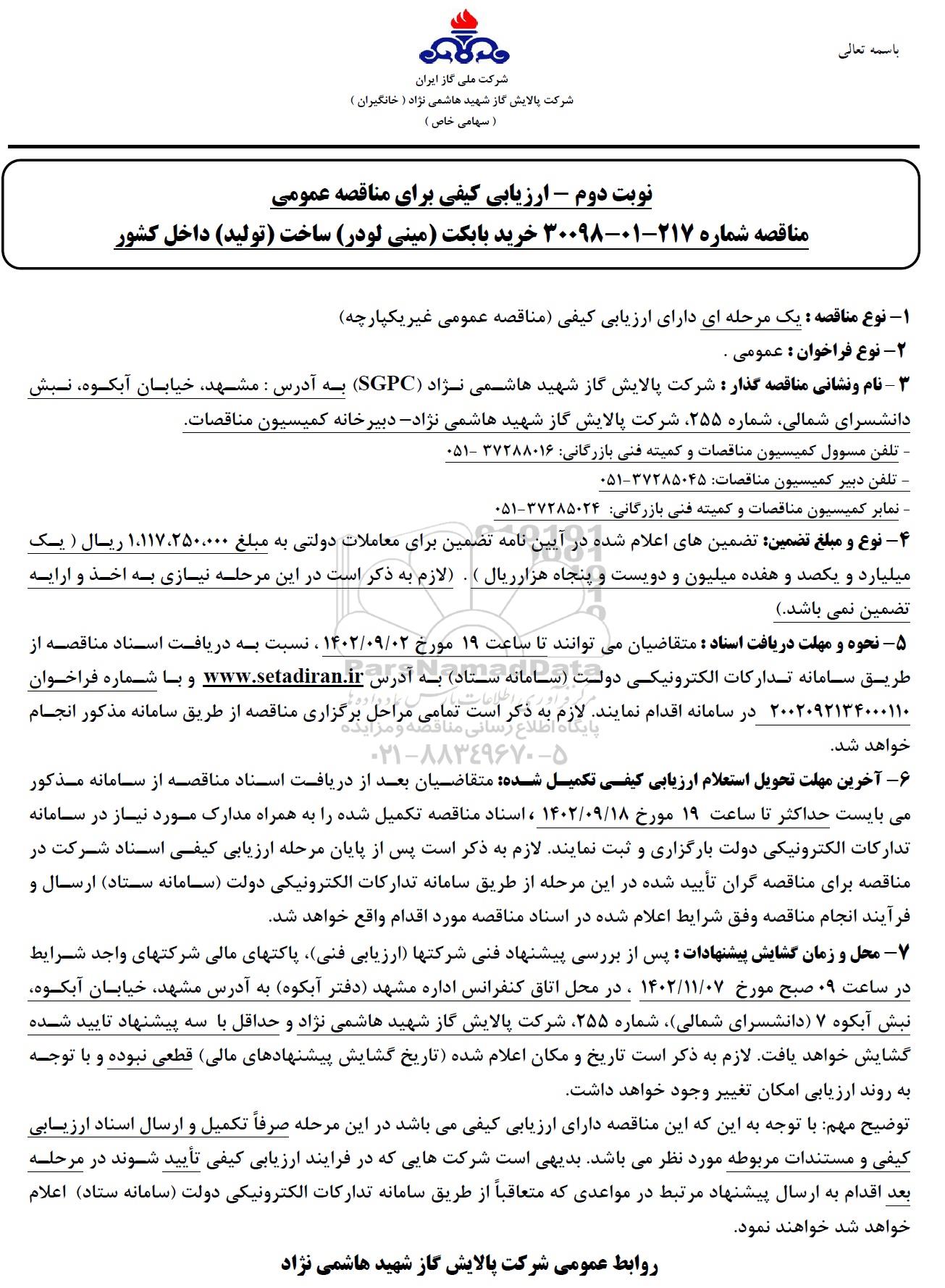 3.نام و نشانی مناقصه گزار: شرکت پالایش گاز شهید هاشمی نژاد (SGPC) به آدرس: مشهد، خیابان آبکو، نبش دانشسرای شماره 255، شرکت پالایش گاز شهید هاشمی نژاد- دبیرخانه کمیسیون مناقصات
